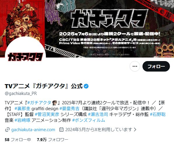 「ガチアクタ」の公式アカウントのフォロワー数は、アニメが放送終了した時点で7.9万人となっていました。