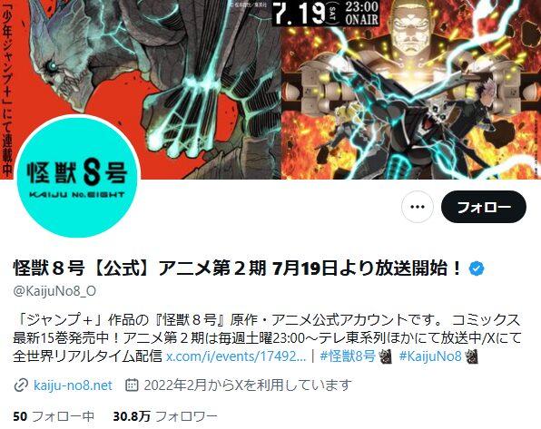 「怪獣8号」の公式アカウントのフォロワー数は、アニメ2期が放送終了した時点で30.8万人となっていました。