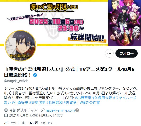 「嘆きの亡霊は引退したい」の公式アカウントのフォロワー数は、アニメ2期が放送した時点で約6.2万となっていました。