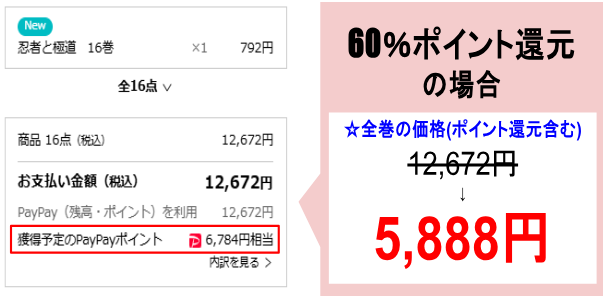 ebookjapanでは毎週末(金・土・日)に「コミックウィークエンド」というキャンペーンを開催しており、この時に購入するとポイント還元が最大50~70%になります。