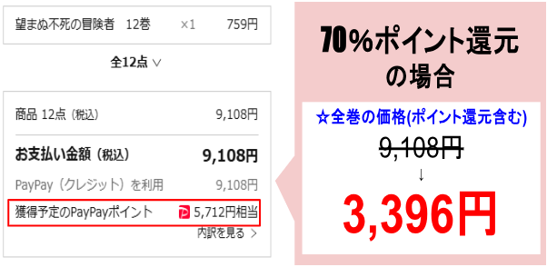 ebookjapanでは毎週末(金・土・日)に「コミックウィークエンド」というキャンペーンを開催しており、この時に購入するとポイント還元が最大50~70%になります。
