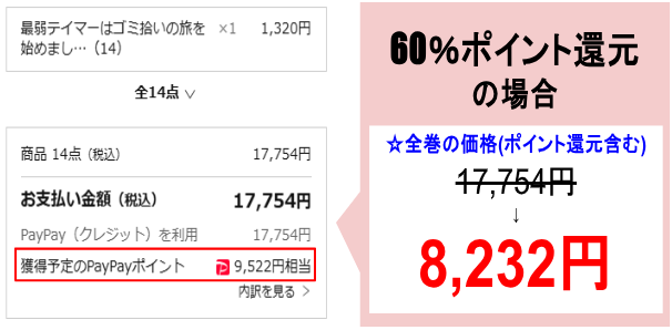 ebookjapanでは毎週末(金・土・日)に「コミックウィークエンド」というキャンペーンを開催しており、この時に購入するとポイント還元が最大50~70%になります。
