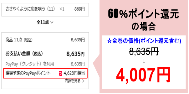 ebookjapanでは毎週末(金・土・日)に「コミックウィークエンド」というキャンペーンを開催しており、この時に購入するとポイント還元が最大50~70%になります。
